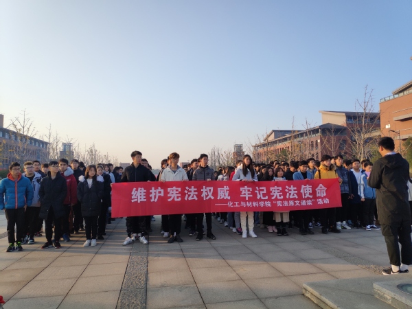 活动中,19化二班团支书李清晨作为领读人,带领全体同学用诵读宪法原文节选内容,“全国各族人民、一切国家机关和武装力量、各政党和各社会团体、各企业事业组织,都必须以宪法为根本的活动准则,并且负有维护宪法尊严、保证宪法实施的职责……”同学们的诵读声慷锵有力、掷地有声。