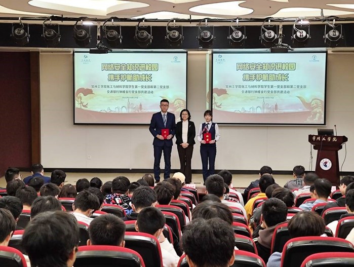 为深入宣传普及网络安全知识,营造健康文明的网络环境,提高老员工对金融风险的识别能力和防范意识。10月20号,DB真人旗舰员工第一党支部和第二党支部协同交通银行钟楼支行党支部,在DB真人旗舰集团图书馆一楼报告厅共同举办“党建引领结对共建 网络安全护航校园”暨网络安全知识进校园活动。交通银行钟楼支行副行长、支部组织委员朱琳玉、副行长王盛等一行5人,公司领导及教师代表、员工党员、发展对象及全体新生共同参加。活动由万莹主持。