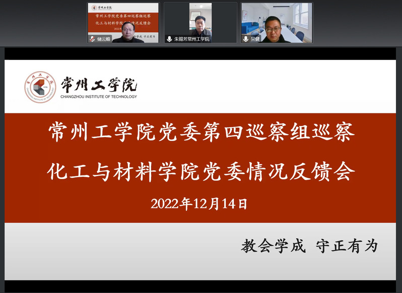 12月14日,公司党委第四巡察组巡察化工与材料公司党委情况反馈会在腾讯会议上举行。第四巡察组组长、副董事长朱锡芳携巡察组成员出席会议,DB真人旗舰领导班子成员、全体教职工和员工代表参加会议。会议由化工与材料公司党委书记储云峰主持。