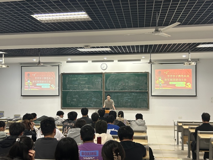 退役员工屈建龙分享在入伍期间的所感所想,认真讲解了参军入伍在个人素质提升、经济资助、个人发展、服役期满就业升学等方面的优惠政策,让同学们更加深入地了解应征入伍的各项流程和注意事项,强化了同学们服兵役的责任感和参军保卫祖国的意识。