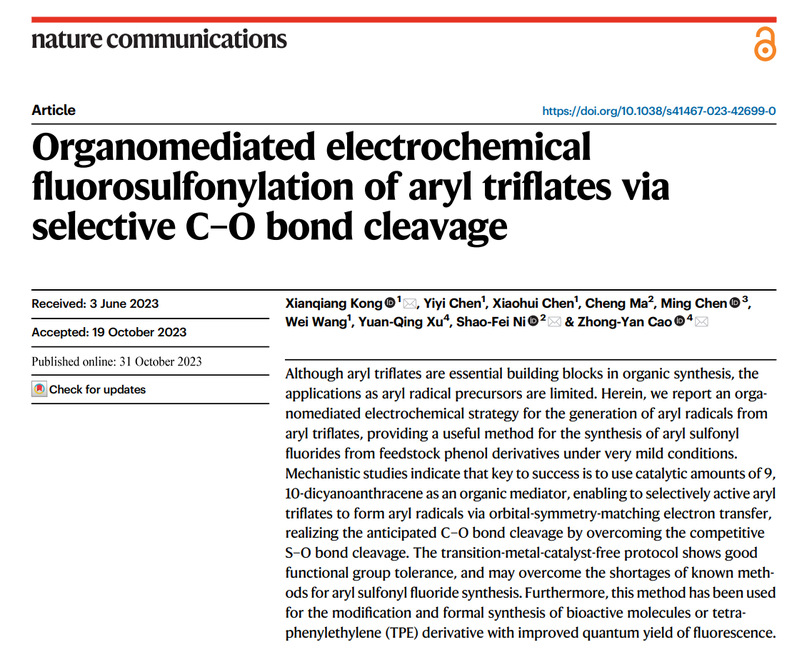 近日,国际顶级期刊《Nature》子刊《Nature Communications》(IF:16.6,中科院一区,TOP期刊,H指数248)在线发表公司“绿色电解液设计与调控”科技创新团队成员孔宪强博士为第一作者的研究论文《Organomediated electrochemical fluorosulfonylation of aryl triflates via selective C–O bond cleavage》,通过电化学条件下碳氧键裂解形成关键官能团,在无过渡金属条件下实现氟磺酰化。公司为第一完成单位和通讯作者单位。